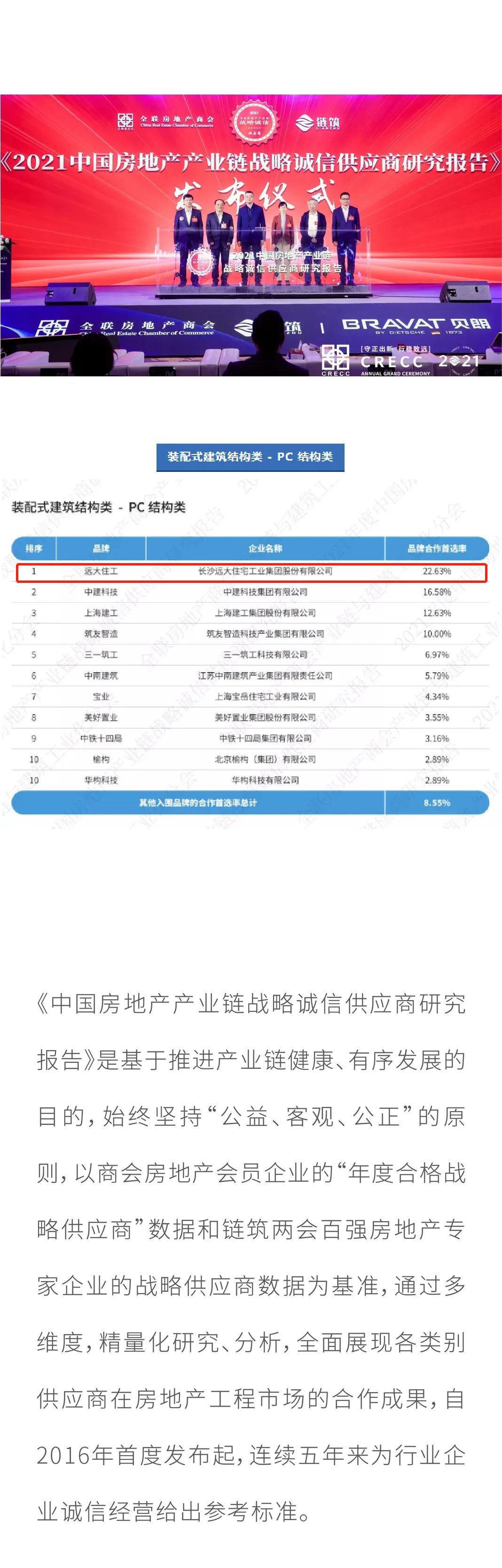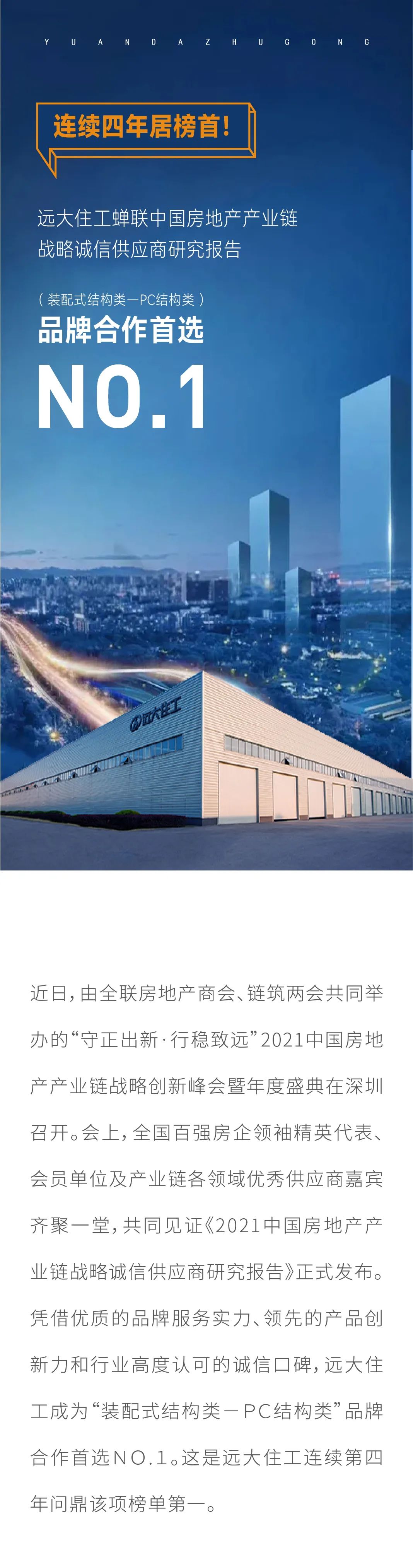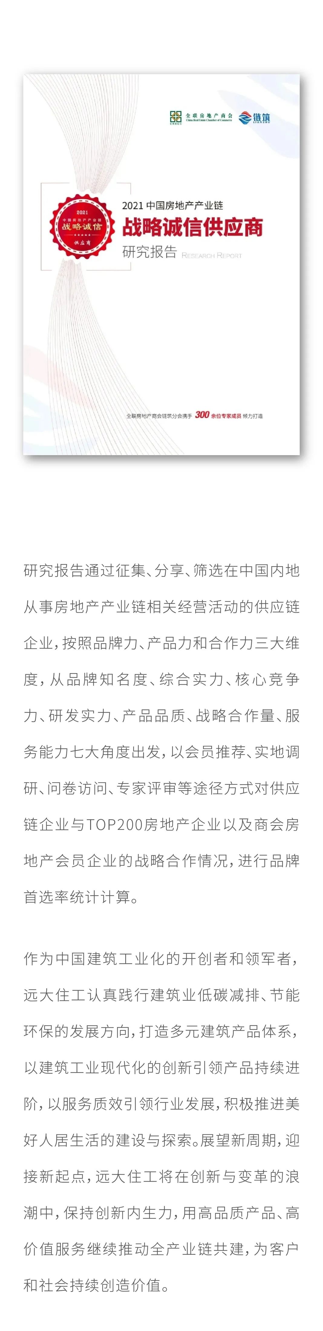 連續(xù)四年居榜首! 遠(yuǎn)大住工蟬聯(lián)中國房地產(chǎn)產(chǎn)業(yè)鏈戰(zhàn)略誠信供應(yīng)商研究報(bào)告 (裝配式結(jié)構(gòu)類-PC結(jié)構(gòu)類)品牌合作首選NO.1